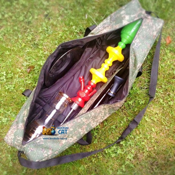 Размеры сумки 90x20x20, стандартно в нее влезают кальяны типа Double Kamanja, Double Decker, Trimetall и тп с колбой. Очень удобная и практичная сумка. Рекомендуем для кальянных вылазок :)