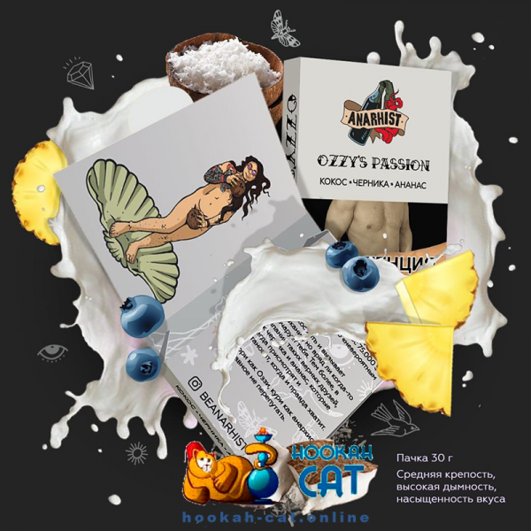 Табак для кальяна Anarhist Ozzy`s Passion (Анархист Кокос Черника Ананас) 30г Акцизный - необычное и довольно классное сочетание кокоса, сладкой черники и немного терпкого, но сладкого ананаса.