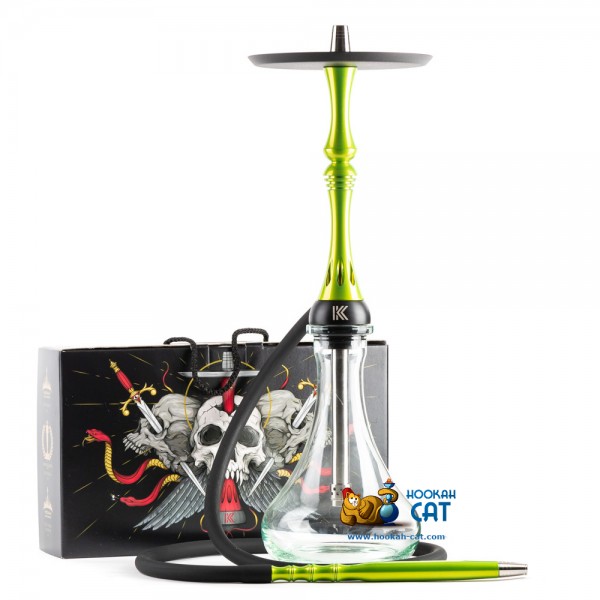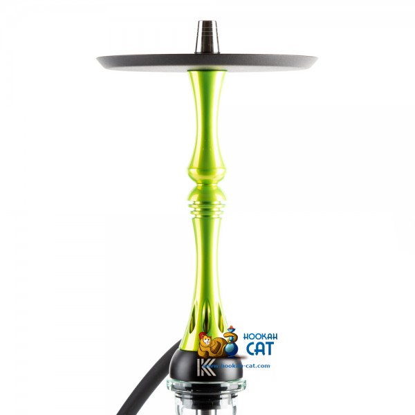 Кальян среднего размера (высота с колбой примерно 55см), но при этом шахта сделана из нержавеющей стали, а корпус кальяна из анодированного алюминия и немецкого полиацеталя. Мундштук абсолютно такой же как у всем известного Model X. Все очень качественно покрашено, включая блюдце, на котором сделана крутая гравировка. Сам кальян покрашен в очень красивый лаймовый цвет.