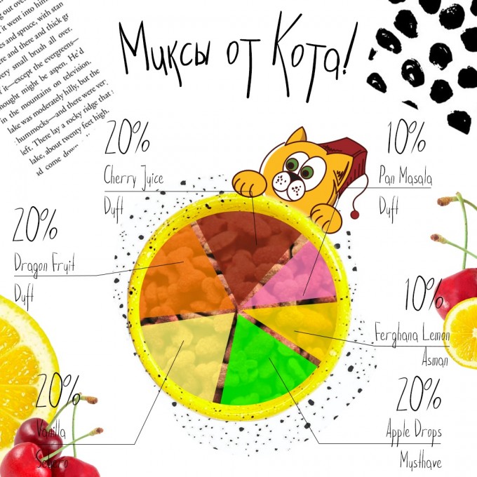 Миксы для кальяна - Пряные Тропики (Duft Cherry Juice, Duft Dragon Fruit, Sebero Vanilla, Musthave Apple Drops, Duft Pan Masala, Asman Ferghana Lemon)