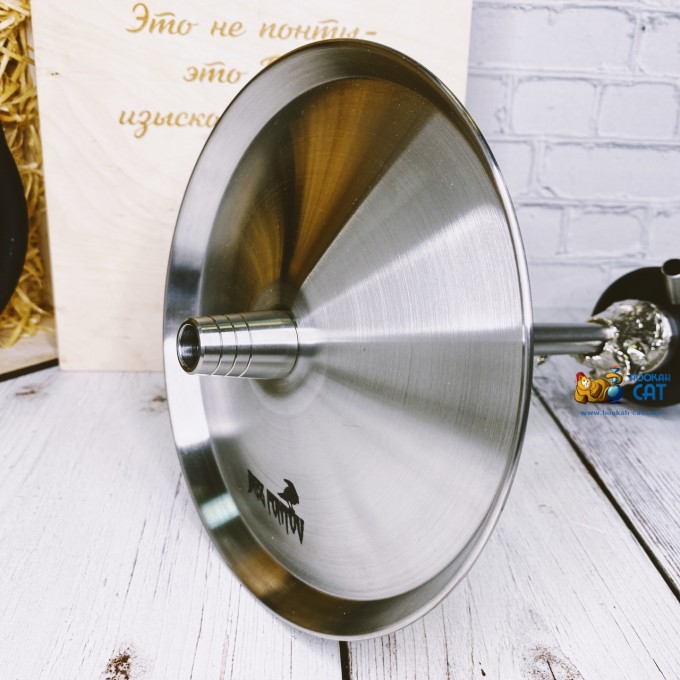 Сама она из латуни и гармонично сочетается со всеми остальными деталями кальяна из нержавеющей стали и полиацеталя, а на блюдце предусмотрены удобные бортики, благодаря которым уголь никак не упадет.